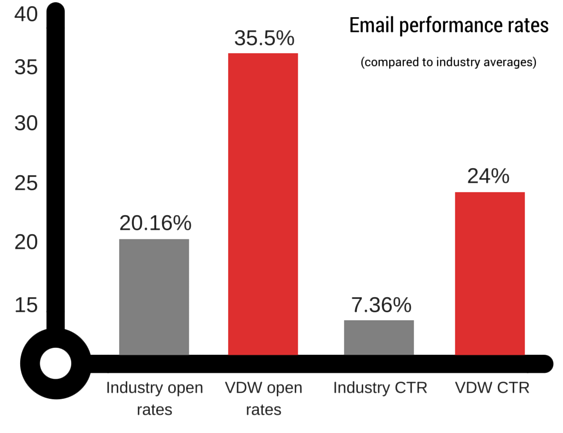 Their next-biggest converter is the audience-specific whitepapers, which are downloaded dozens of times per month and are responsible for most of the newsletter subscriptions. Van Delden’s quarterly newsletter goes out to thousands of people and has an average 35.5% open rate and 24% click-through-rate — in an industry where the averages are 20.16% and 7.36%, respectively.