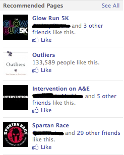 From a marketing perspective, the most beautiful thing about Facebook advertising is that users are doing the basic market research for you by adding their age, gender, location, and interests. So when I log onto Facebook, the whole right side of my News Feed is “Recommended Pages” that are generated from the demographic information that Facebook already has about me outlined above.
